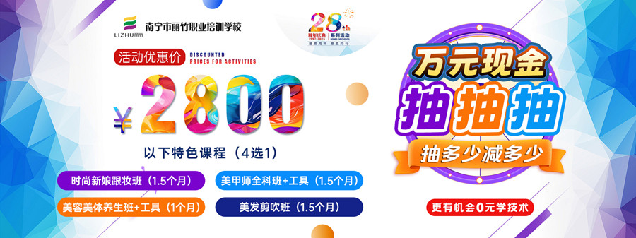 如果你對化妝感興趣,想知道廣西化妝培訓(xùn)去哪學(xué)?或是想知道廣西學(xué)化妝哪里便宜?那接下愛這個好消息千萬不要錯過了!麗竹學(xué)校今年正值建校28周年,為回饋大家一直以來的支持,學(xué)?,F(xiàn)正在進行報讀優(yōu)惠活動。所以,想學(xué)美業(yè)技術(shù)的你,千萬不要錯過!