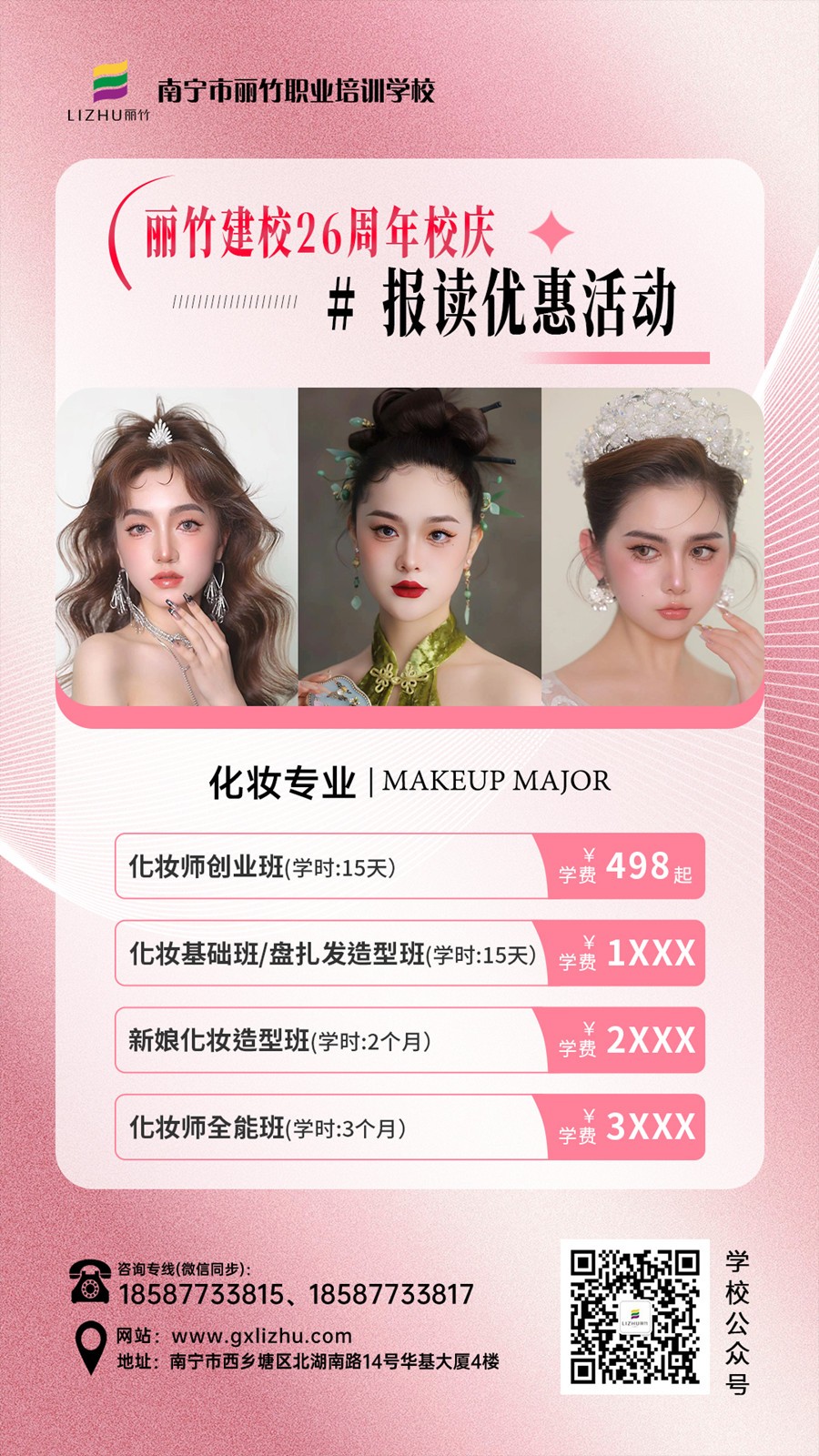 想要畫(huà)出一個(gè)精致完整的妝容,你需要掌握全面切系統(tǒng)的化妝培訓(xùn)手法,這樣才能將每個(gè)化妝步驟所帶來(lái)的效果很好呈現(xiàn)出來(lái)。所以,想在南寧學(xué)化妝技術(shù),想知道南寧化妝學(xué)校哪家學(xué)費(fèi)便宜?那千萬(wàn)不要錯(cuò)過(guò)麗竹學(xué)?,F(xiàn)在正在進(jìn)行的“優(yōu)惠報(bào)讀”啦!