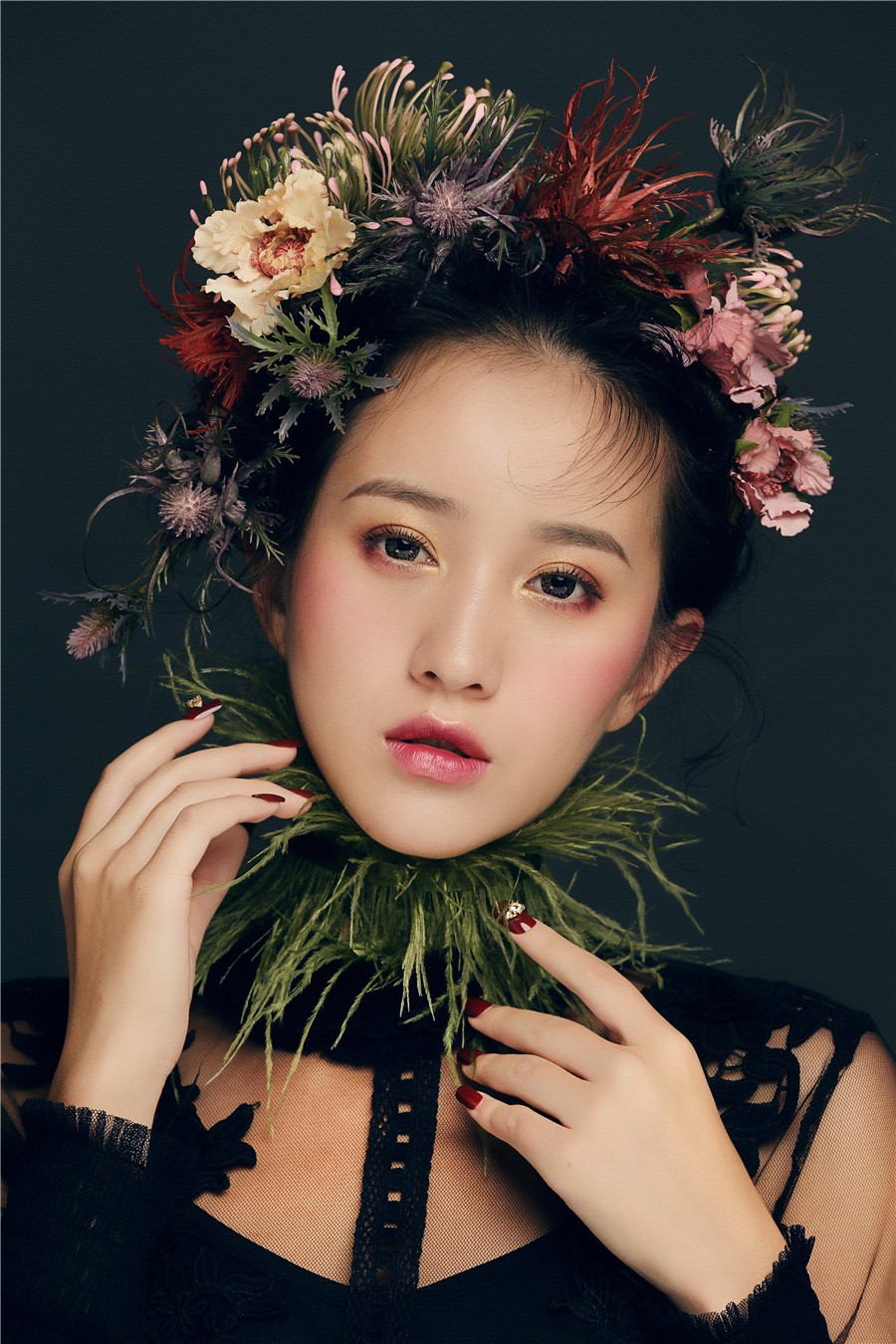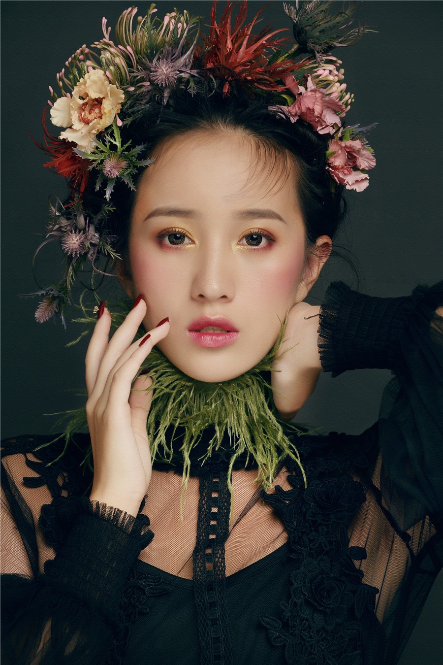 麗竹學(xué)校彩妝作品--復(fù)古油畫風(fēng):飽滿濃郁的妝面色彩,配以仙氣十足森系田園風(fēng),搭上靈動的發(fā)絲在陽光下跳躍,營造出了一種別樣的浪漫氣氛,宛如華中走出的女子。