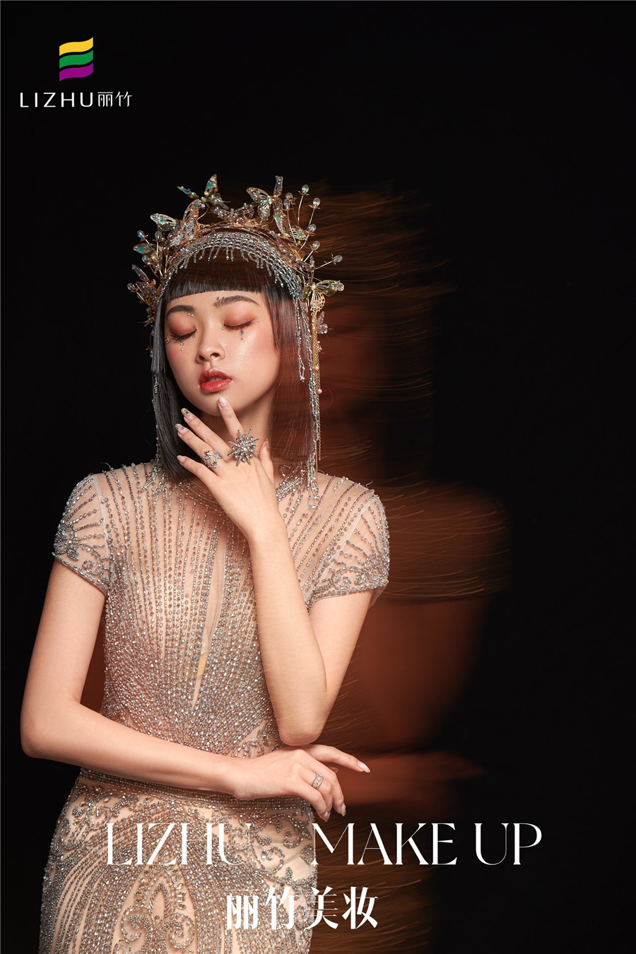 麗竹化妝學(xué)校作品---輕奢復(fù)古造型:奢華透視薄紗款禮服,勾勒出婀娜曼妙的身姿,頭飾與服飾滿鉆的鑲嵌,閃爍波光粼粼的神秘感,如夢(mèng)如幻間與現(xiàn)實(shí)交替!