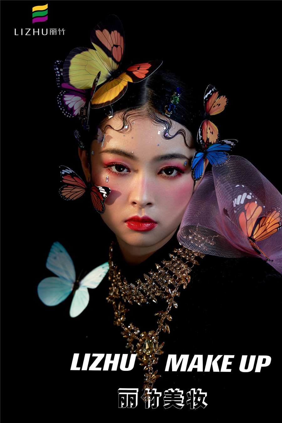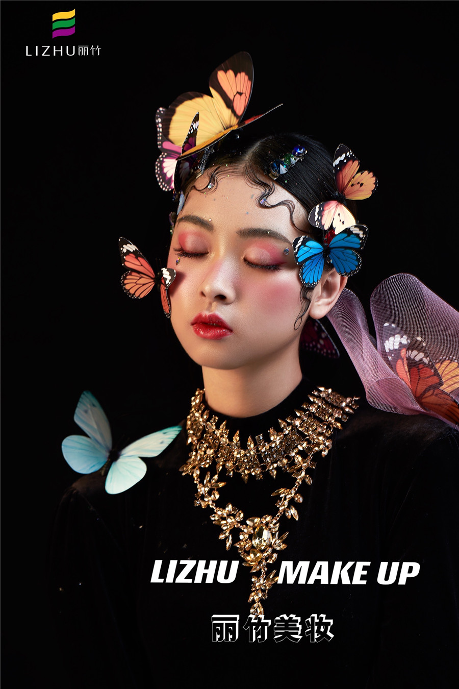麗竹化妝學(xué)校作品---唯美蝴蝶妝容:肩頭兩鬢和眼前額頭,被五彩斑斕的蝴蝶點(diǎn)綴,強(qiáng)烈的黑色背景搭配亮眼色差,產(chǎn)生了很強(qiáng)的視覺(jué)效果,讓人過(guò)目不忘之余,更寓意破繭成蝶涅槃重生的狀態(tài)。