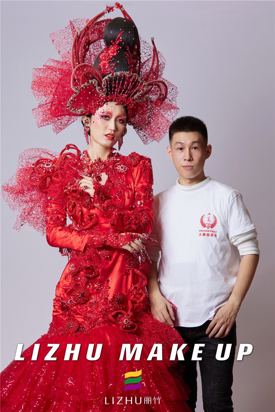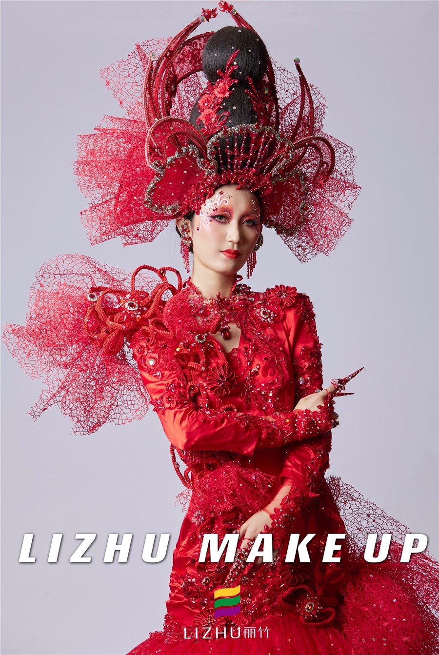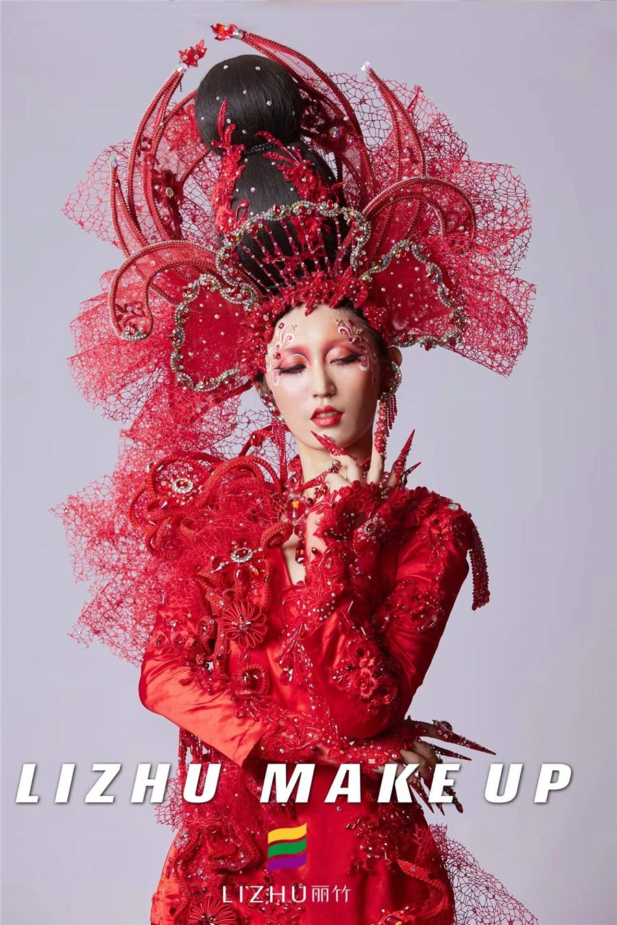 南寧創(chuàng)意造型培訓(xùn)學(xué)校創(chuàng)意彩妝作品---戰(zhàn)姬:這款整體造型以“中國(guó)紅”為主色,修身的魚尾裙擺設(shè)計(jì)配以水鉆、刺繡和精致的頭飾,妝面以紅色為主,運(yùn)用簡(jiǎn)單線條描繪以及大面積暈染的手法處理,妝面與服裝、頭飾相呼應(yīng),視覺沖擊十足。