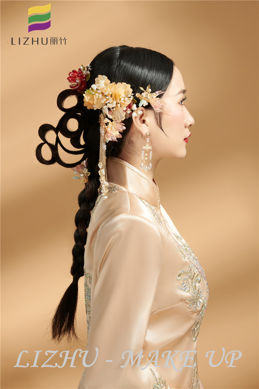 廣西正規(guī)彩妝培訓(xùn)、廣西排名前十彩妝學(xué)校作品---新中式新娘造型:飽滿的低卷筒盤發(fā),佩戴鎏金玉釵玉簟點(diǎn)綴,女子的優(yōu)雅古典、大方完全展現(xiàn),打造古香古色韻味十足的新中式新娘。廣西彩妝學(xué)校十大名校-麗竹學(xué)校常年開設(shè)廣西彩妝培訓(xùn)班,歡迎大家進(jìn)班參觀試聽。