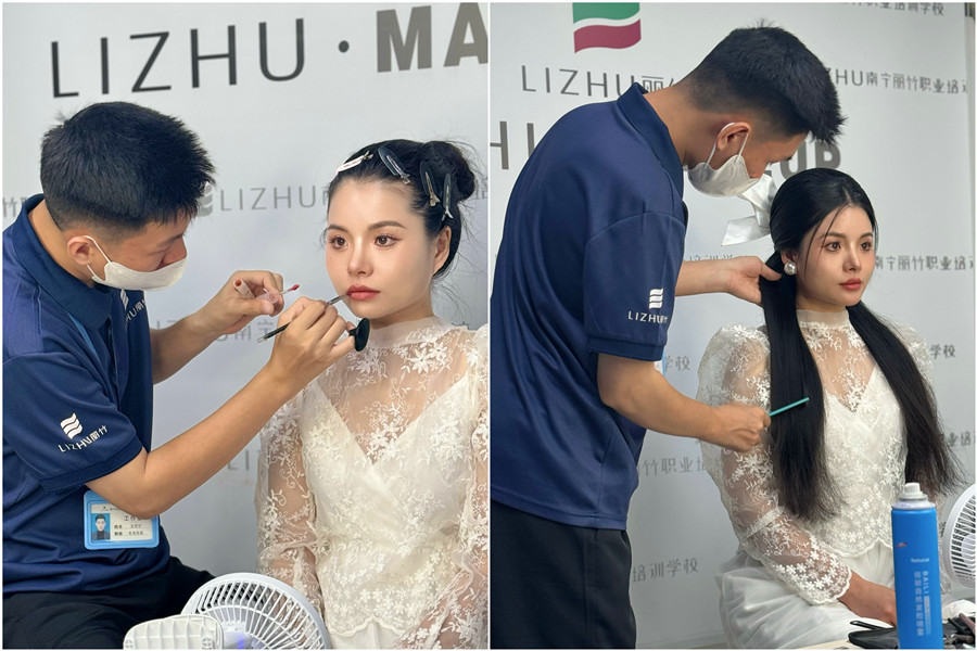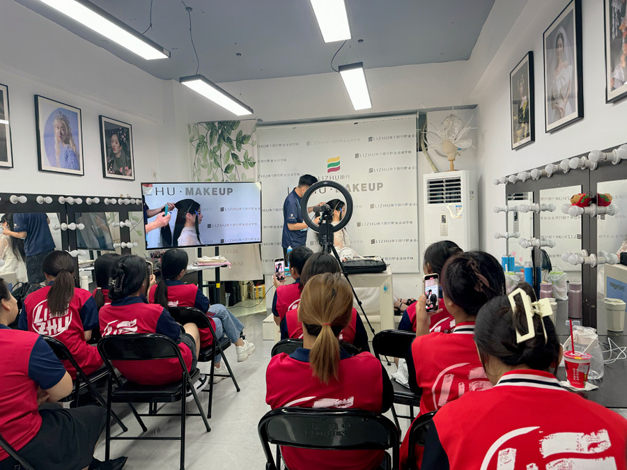 南寧新娘跟妝、南寧學(xué)新娘化妝:在南寧新娘化妝造型學(xué)校(麗竹新娘化妝造型學(xué)校)里南寧新娘化妝進(jìn)修班的教室,老師正在為同學(xué)們進(jìn)行時(shí)尚簡(jiǎn)約新娘造型手法演示的同時(shí),還針對(duì)需要注意的細(xì)節(jié)進(jìn)行了詳細(xì)的講解,趕緊一起去看看吧!
