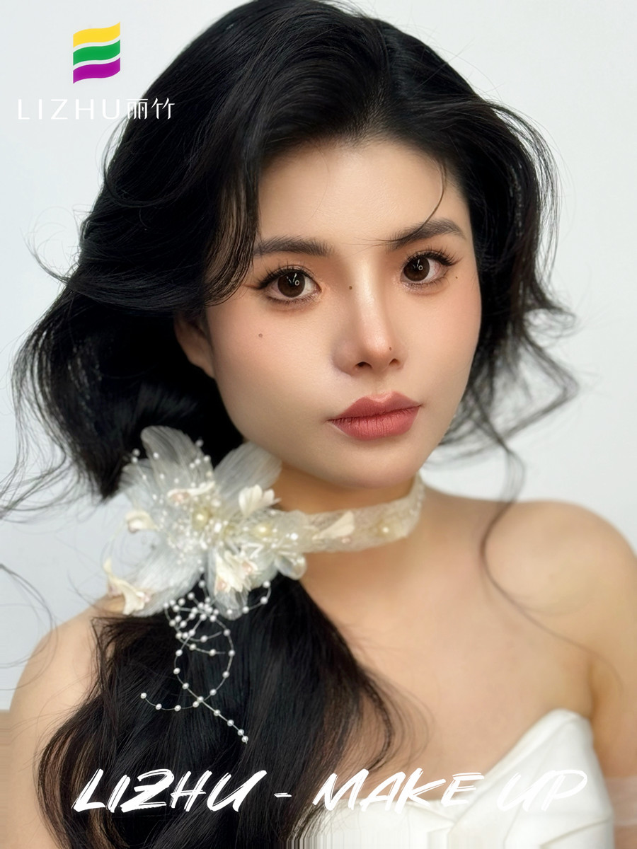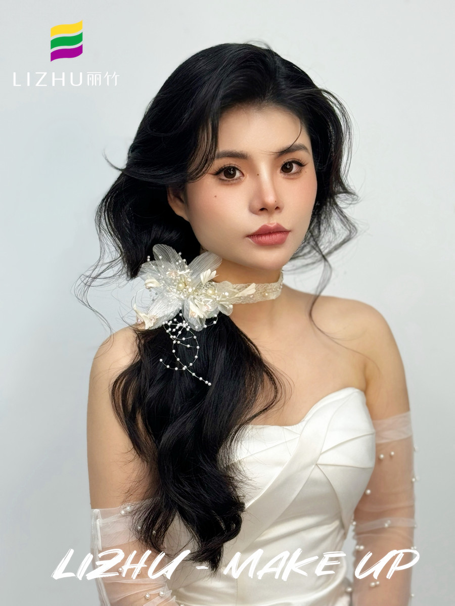 廣西學(xué)化妝影樓、廣西寫真化妝,廣西新娘妝跟妝培訓(xùn)(麗竹寫真化妝培訓(xùn))--- 韓式側(cè)扎紋理新娘:氧氣清新的自然無痕妝容,優(yōu)雅隨意的紋理韓式卷發(fā),白色蕾絲珠花頭飾側(cè)扎發(fā),打造氣質(zhì)滿滿的元?dú)饷郎倥?