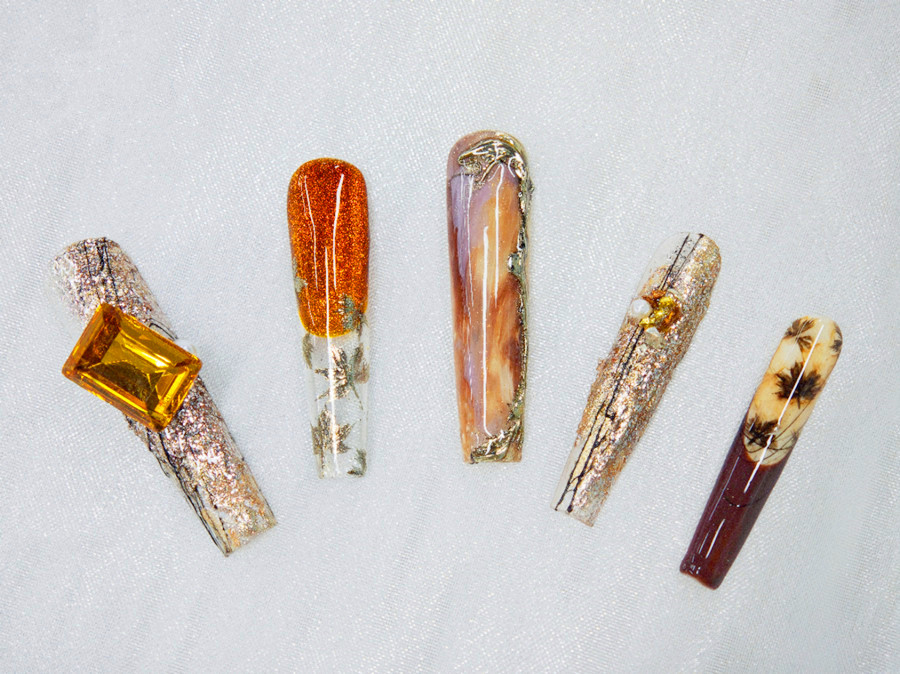廣西美甲課堂實訓(xùn)、廣西美甲培訓(xùn)實操:整副作品主要是以暈染技術(shù)和水晶砂礫共同打造而成。以透明底作為底色,用暈染液打造出的琥珀色的圖案營造出夕陽的氛圍感。再用水晶砂和金箔紙繪制出楓葉,暈染出落日般的晚霞,整體視覺營造出了一種非常低調(diào)、優(yōu)雅、夢幻的精致感。