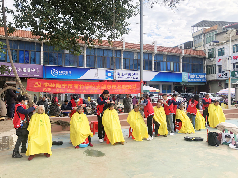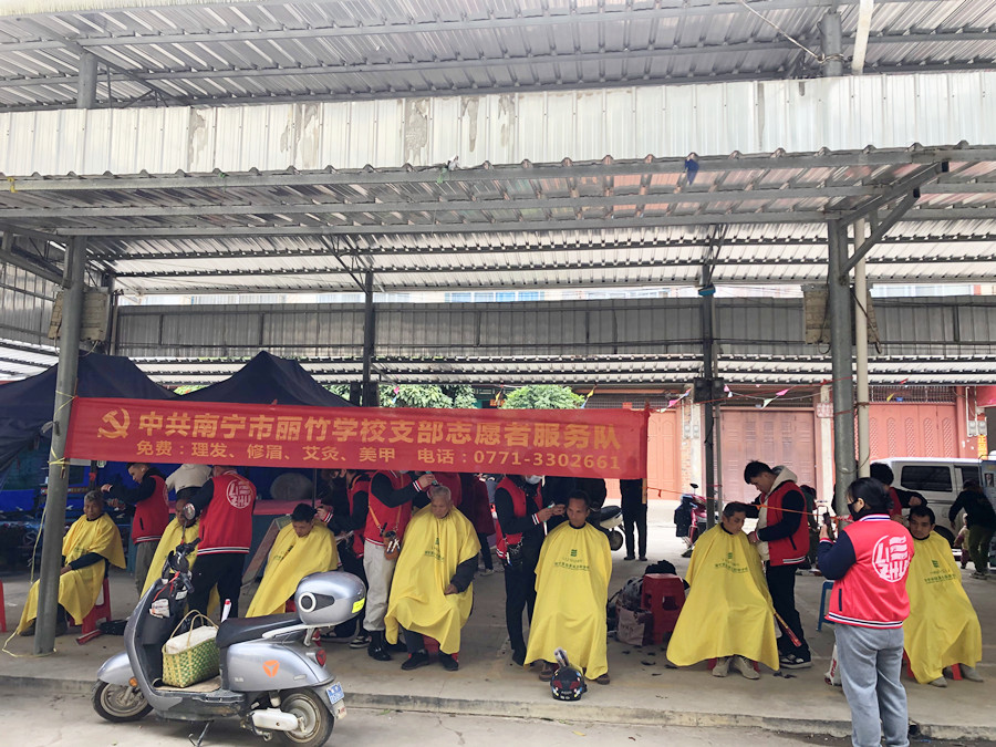 南寧美發(fā)社會實(shí)踐報(bào)告、南寧美發(fā)教學(xué)外出:霜凍籠罩在上空,呼呼刮來的冷風(fēng),連綿不斷的陰雨讓本就寒冷的氣溫變得更加刺骨難耐。但即便是在這樣的天氣下,南寧美發(fā)職校志愿者服務(wù)隊(duì)的同學(xué)們依舊走訪在各大周邊城鎮(zhèn),為群眾們進(jìn)行免費(fèi)理發(fā)服務(wù)。下面,就請跟著南寧美發(fā)造型培訓(xùn)(麗竹美發(fā)造型培訓(xùn))的鏡頭一起去看看同學(xué)們都去了哪些地方吧!