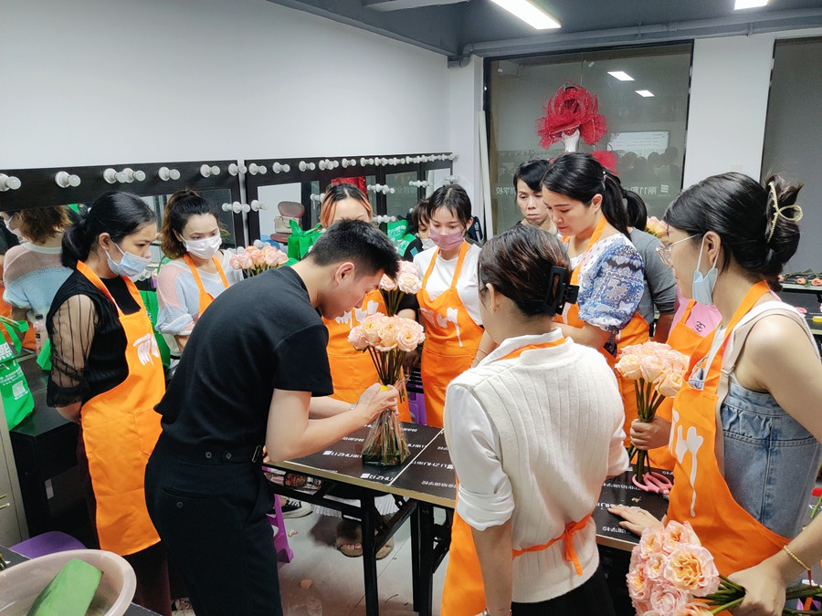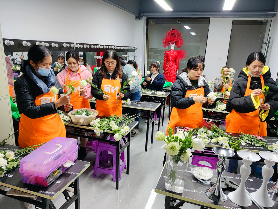 學(xué)員動手實(shí)操進(jìn)行插花練習(xí)