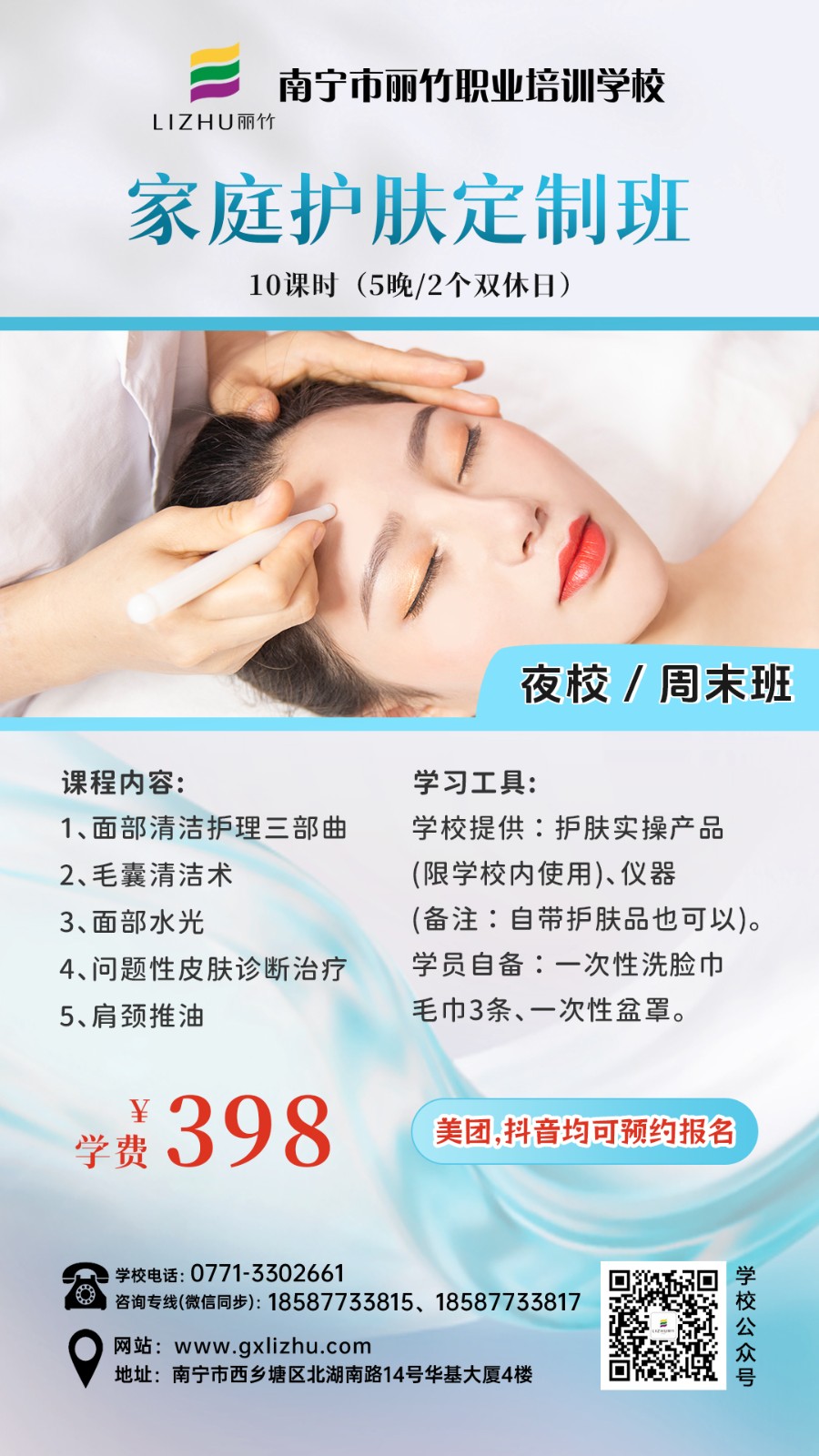 南寧美業(yè)技術培訓學校-麗竹學校特色課程推薦---夜班/周末班,來咯![慶祝][太陽]無論你是上班族,寶媽,自由從業(yè)者……無論你想周末上課,還是上晚課,統(tǒng)統(tǒng)都由你說了算??!