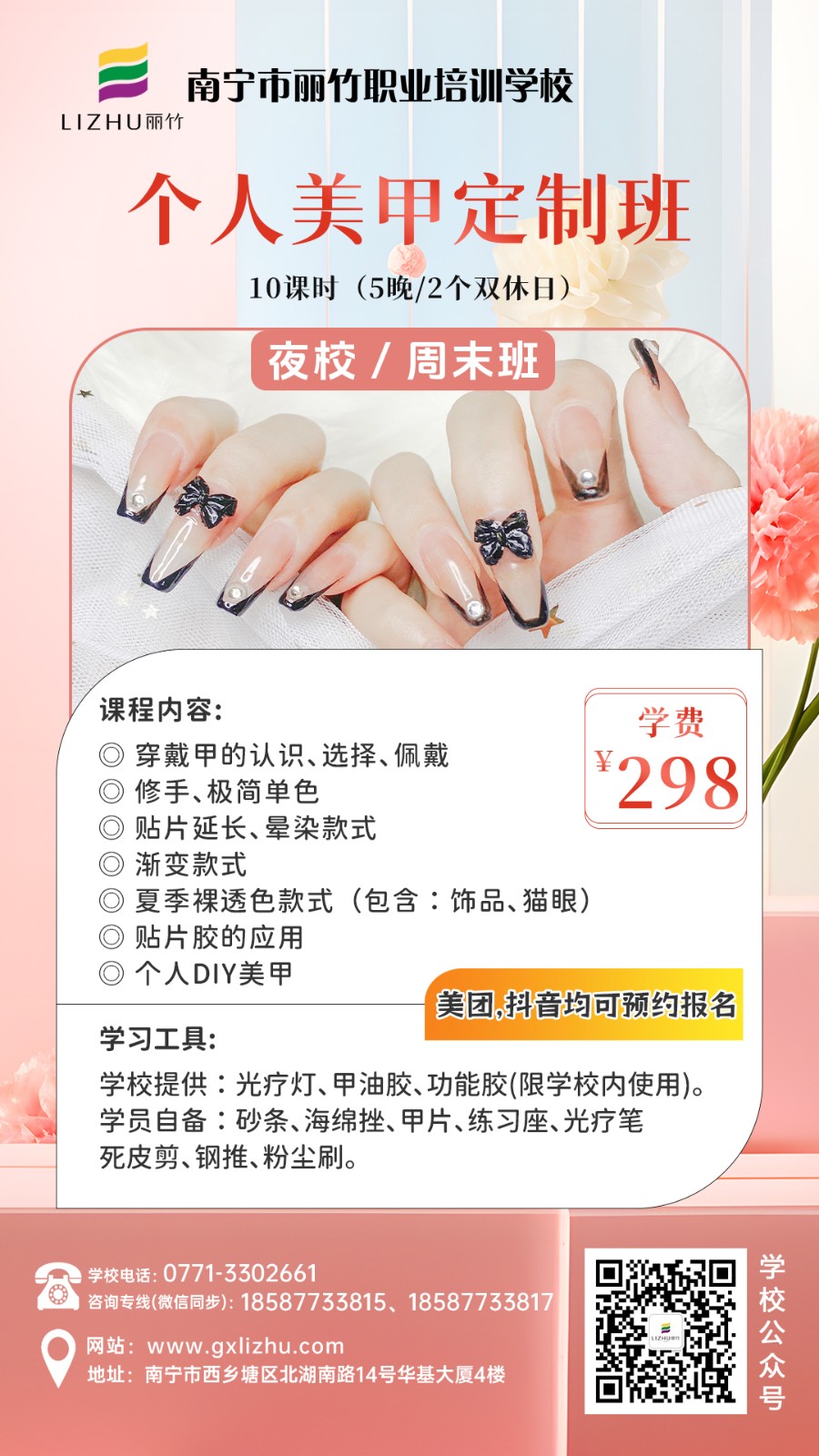 南寧美業(yè)技術培訓學校-麗竹學校特色課程推薦---夜班/周末班,來咯!南寧化妝培訓學校(個人形象化妝班)、南寧美甲培訓學校(個人美甲定制班)、南寧美容護膚培訓學校(家庭護膚定制班)、南寧紋繡培訓(水晶唇深造課)、南寧眉眼唇培訓學校(眉眼定制課)。